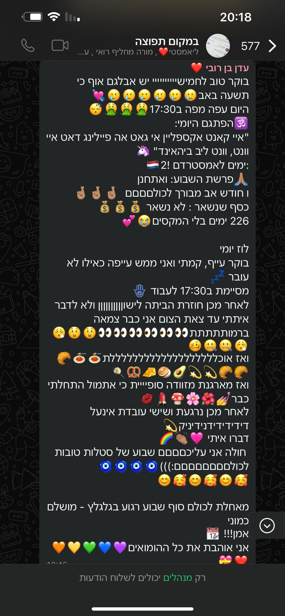 כדי להיות בקשר תמידי עם כולם, עדן הקימה וניהלה קבוצת וואטסאפ עם 30 חברים ועם סבתא שלה. רק עדן יכלה לכתוב בקבוצה, והיא קראה לה “במקום תפוצה”.